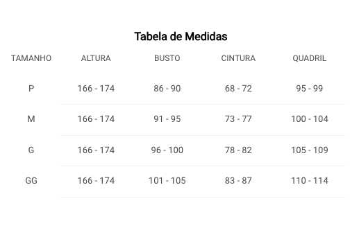 A modelagem veste perfeitamente do tamanho P, proporcionando conforto e liberdade de movimento. Confira a tabela de medidas para garantir o ajuste ideal.